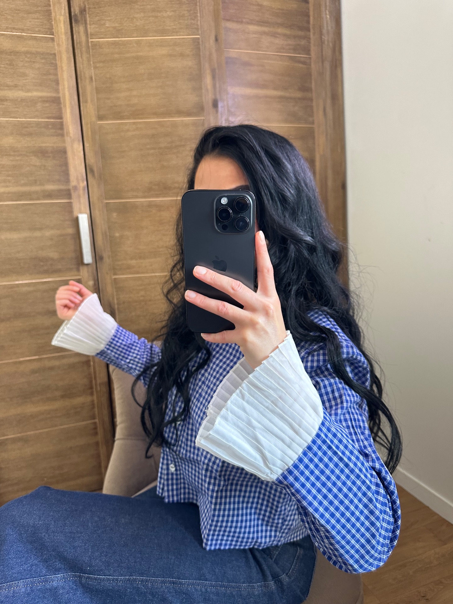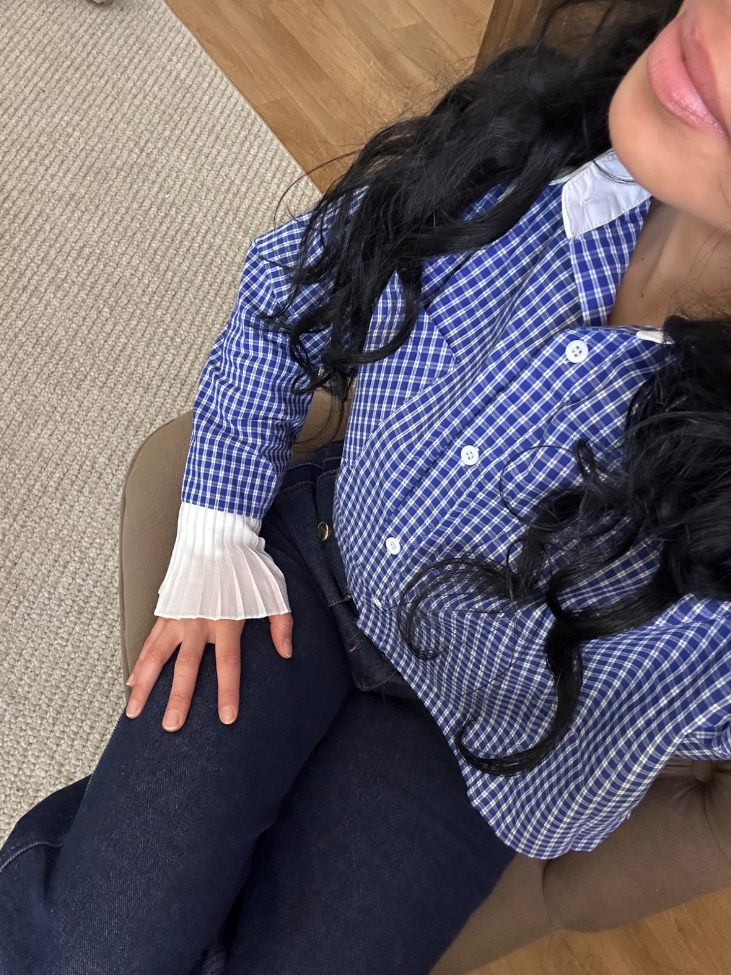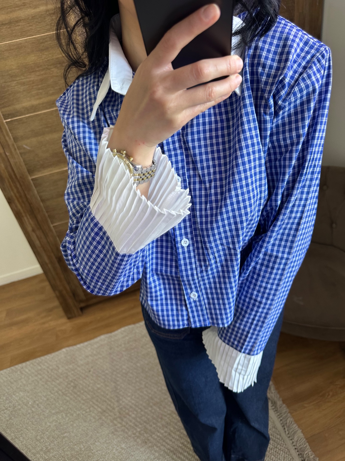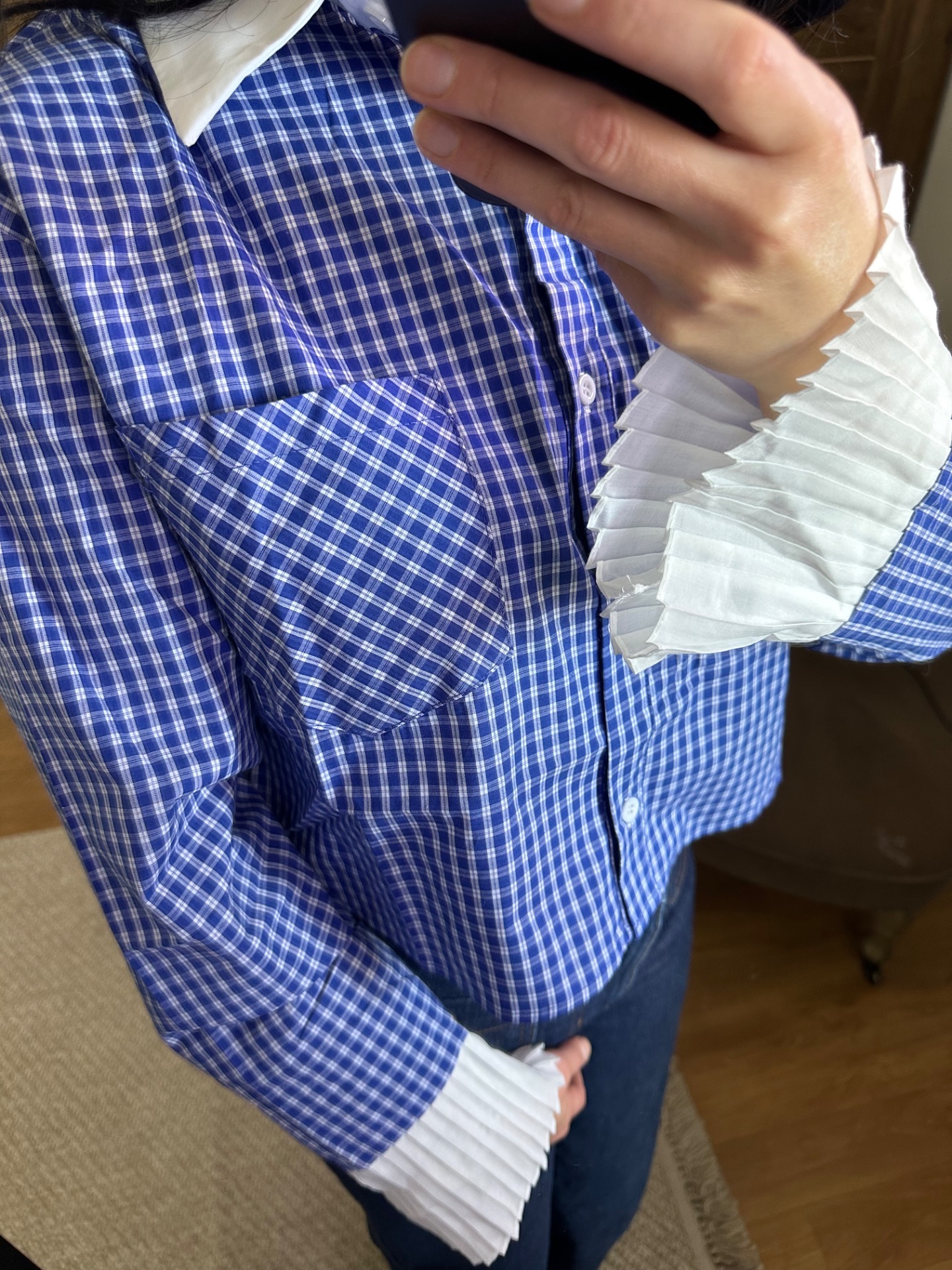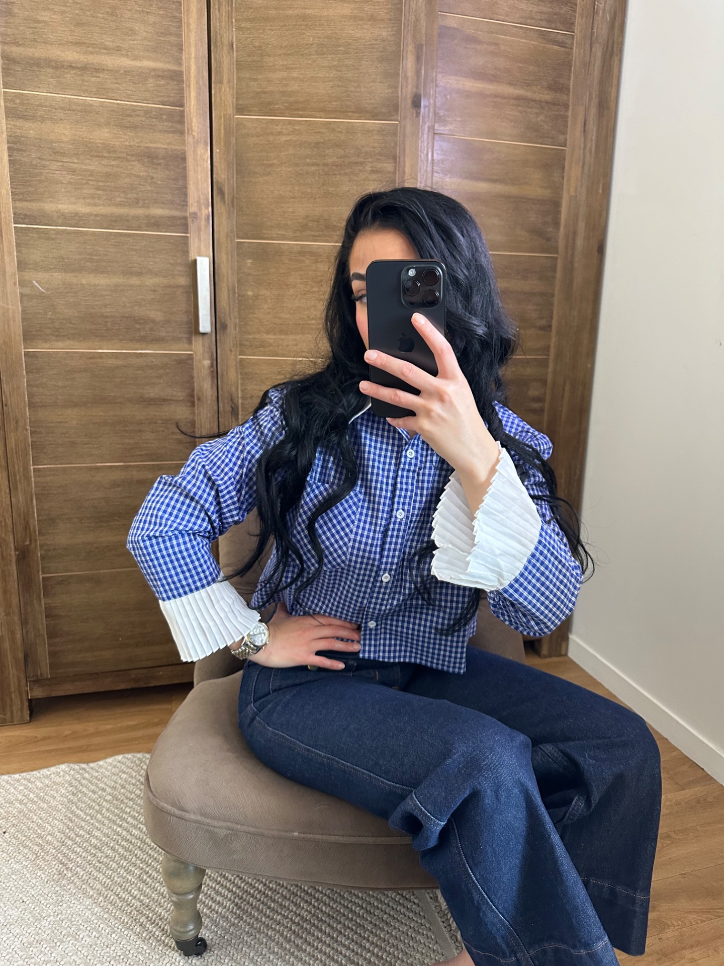 Un contraste entre le motif vichy classique et les poignets plissés qui apportent un volume élégant. Une pièce originale qui se suffit à elle-même.