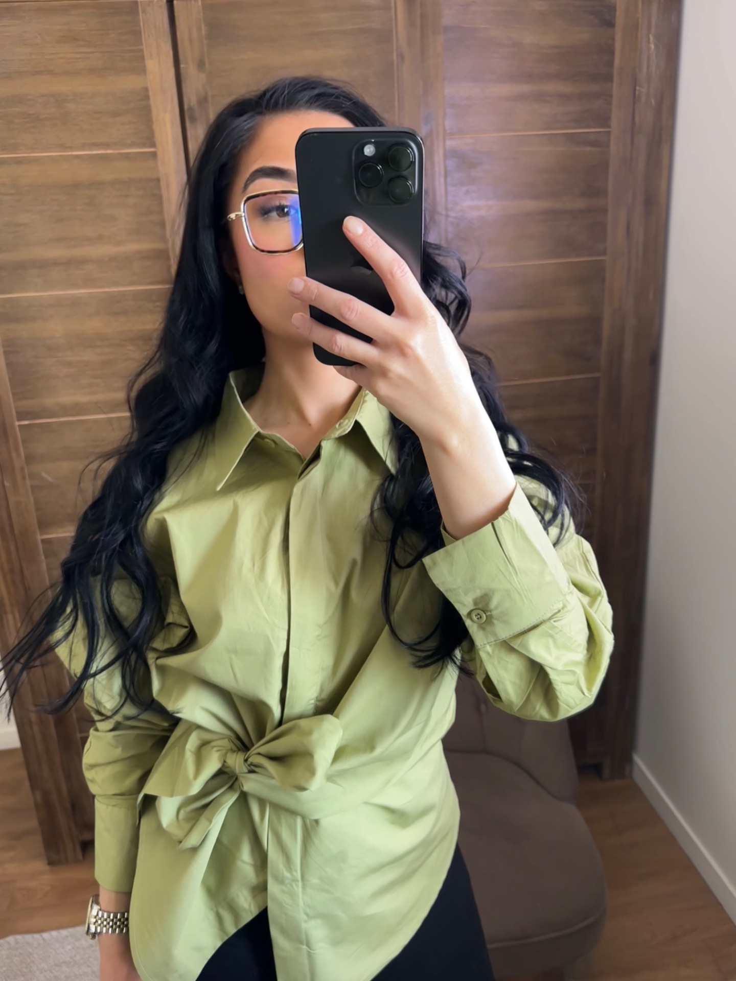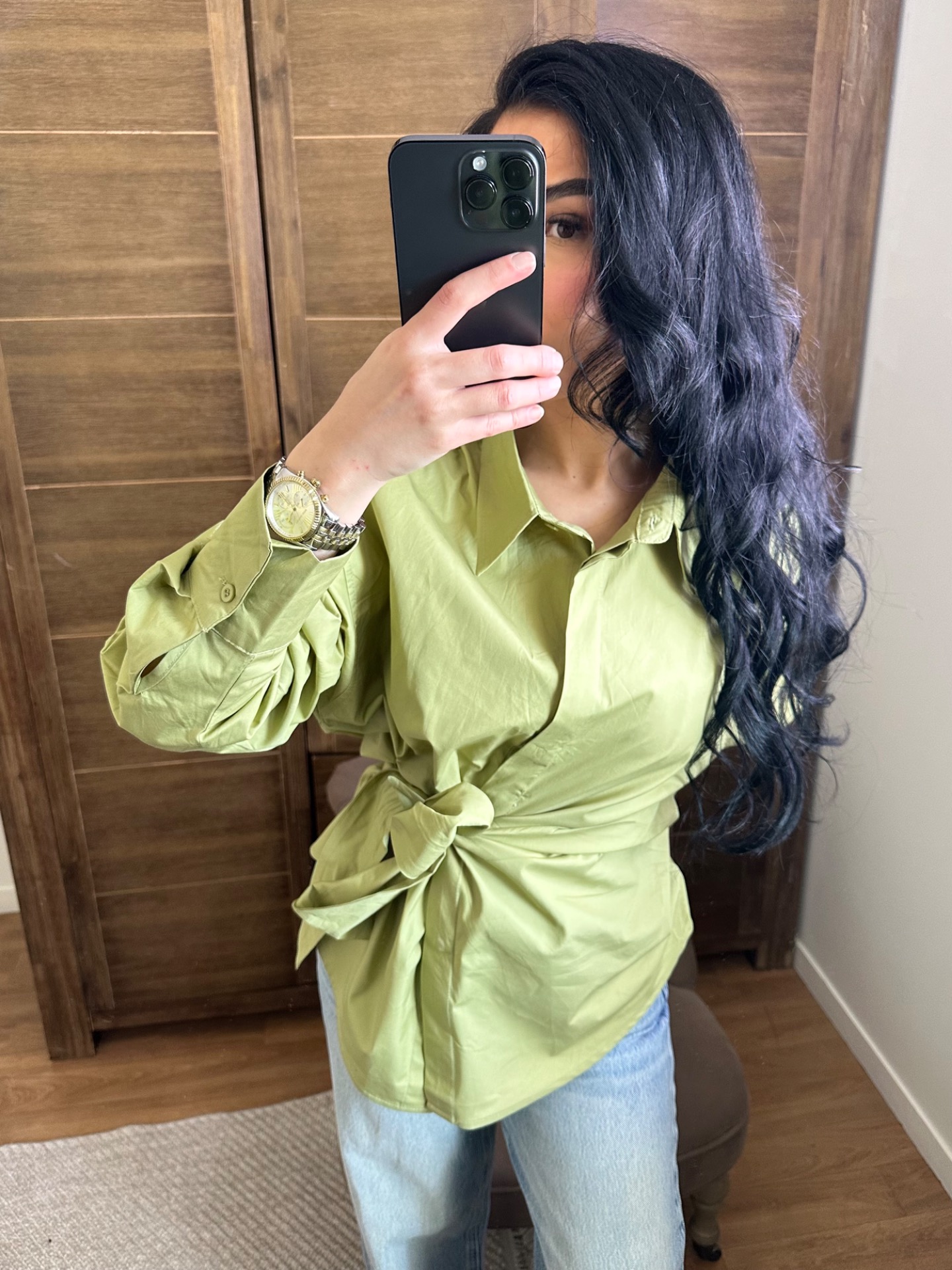 Blouse verte et sa ceinture intégrée à nouer. Ce détail offre une silhouette structurée et moderne.