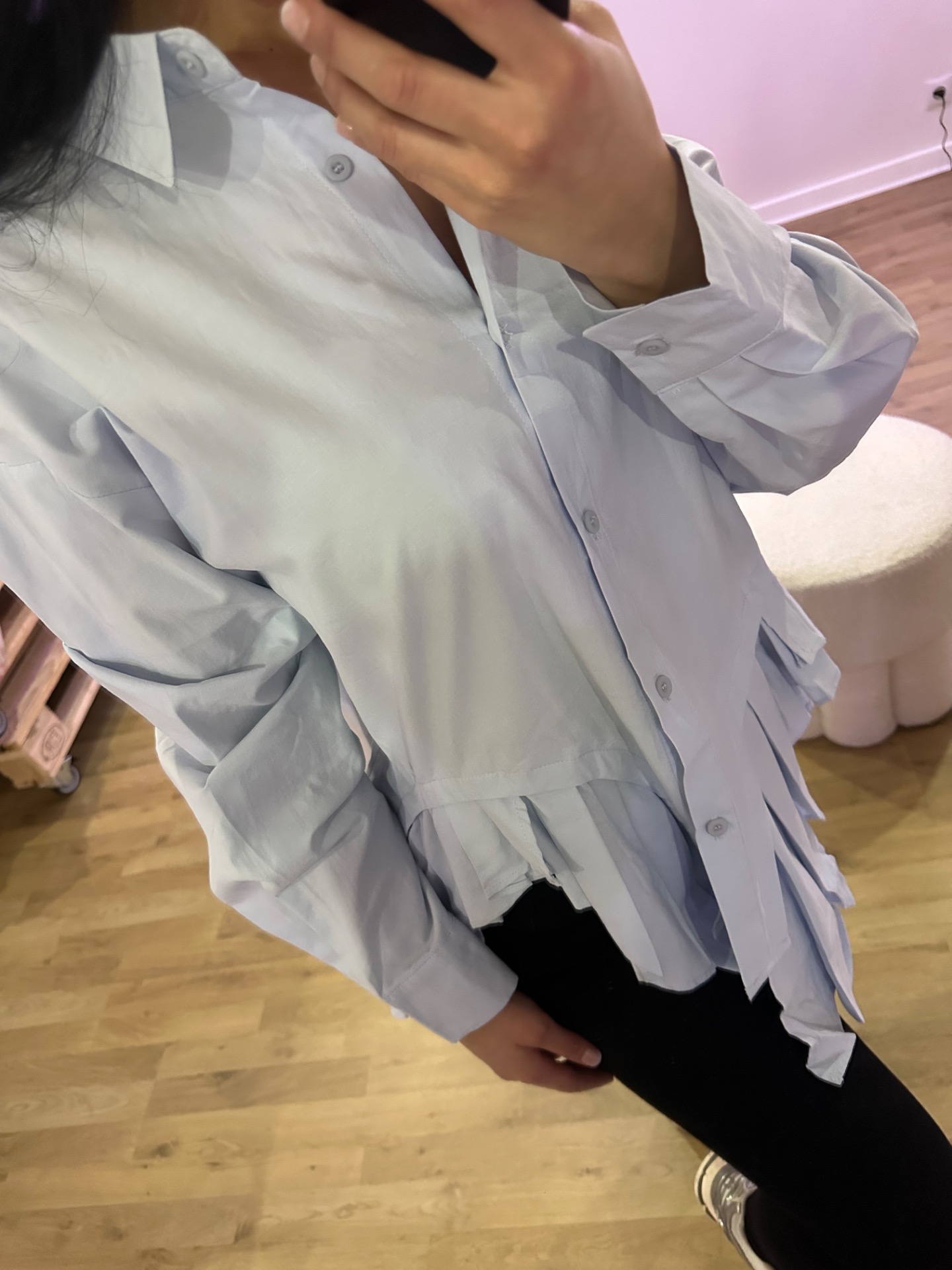Un col chemise traditionnel et des volants au style déstructuré qui apportent une touche d'originalité à une tenue classique.
