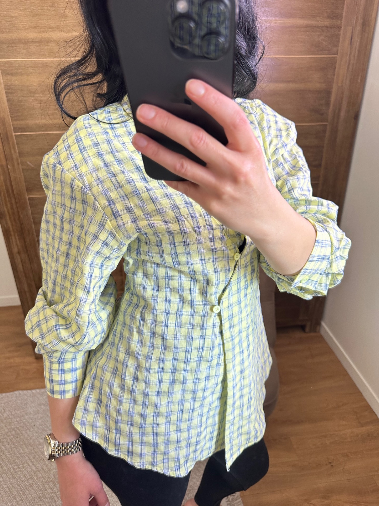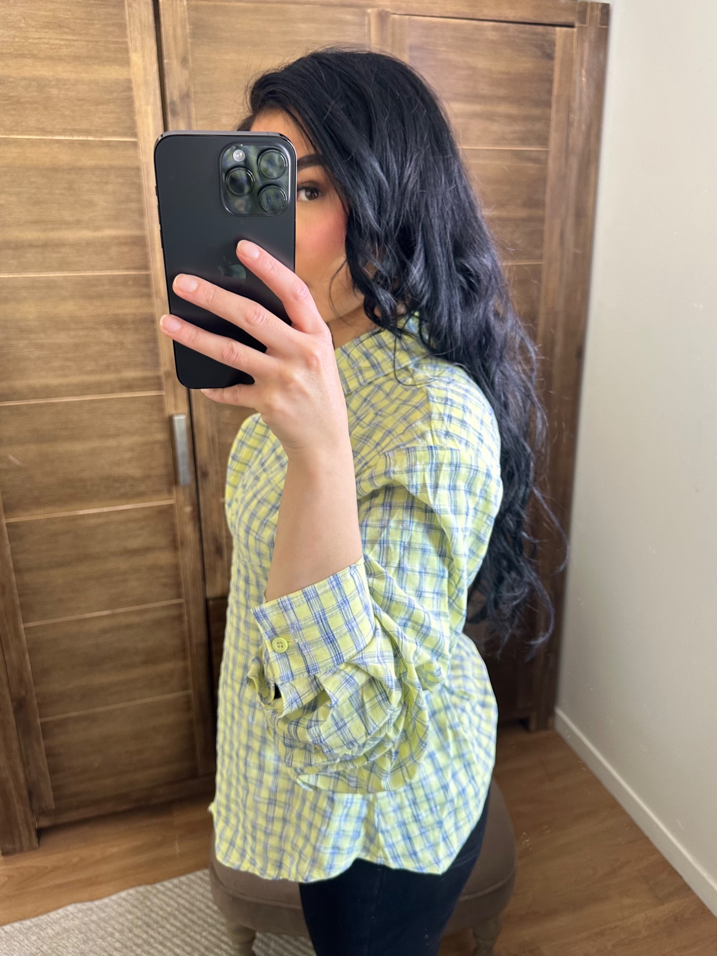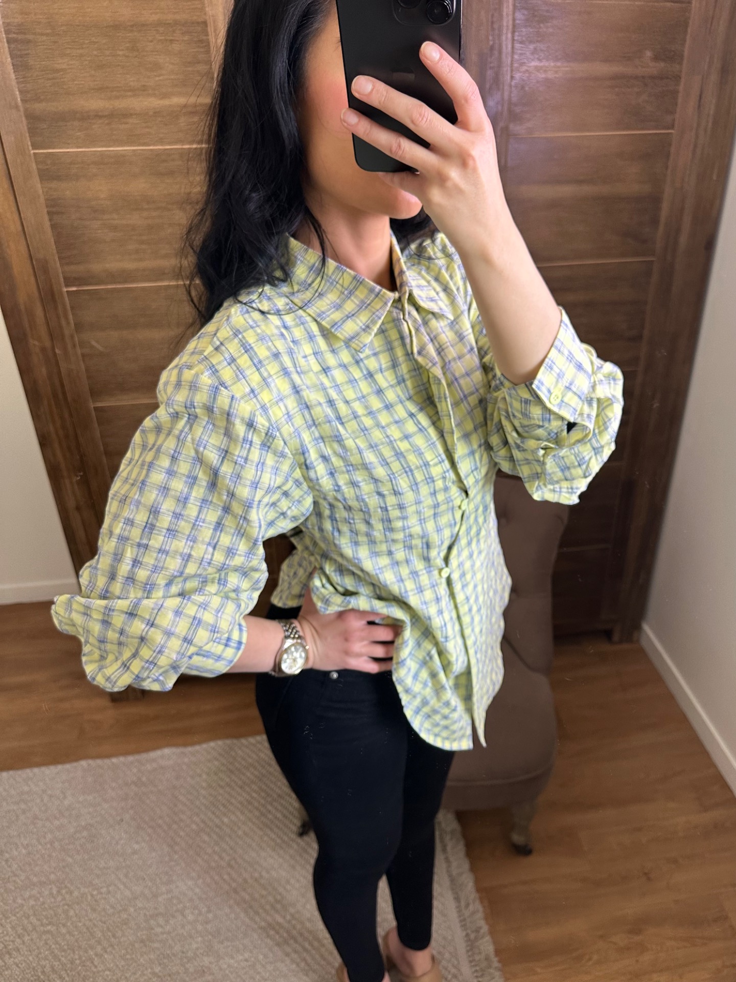 Mettez du peps à votre tenue avec cette chemise à imprimé carreaux vert citron et bleu ! Elle est l'alliée parfaite des beaux jours : elle apporte une touche de fraîcheur immédiate et s'accorde harmonieusement avec tous vos basiques.
